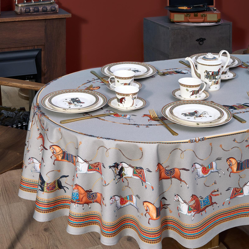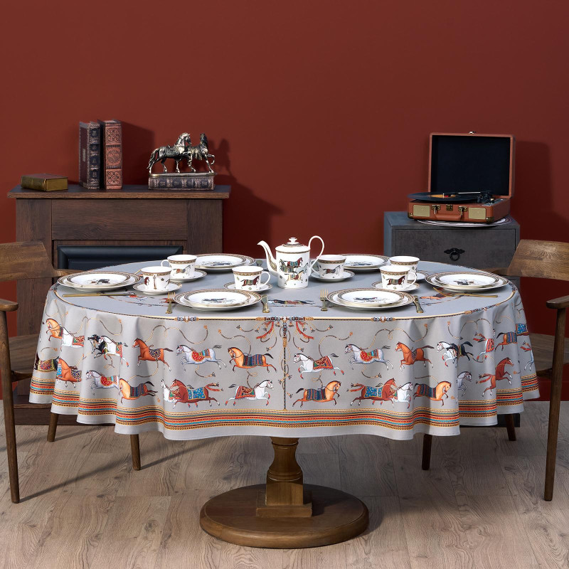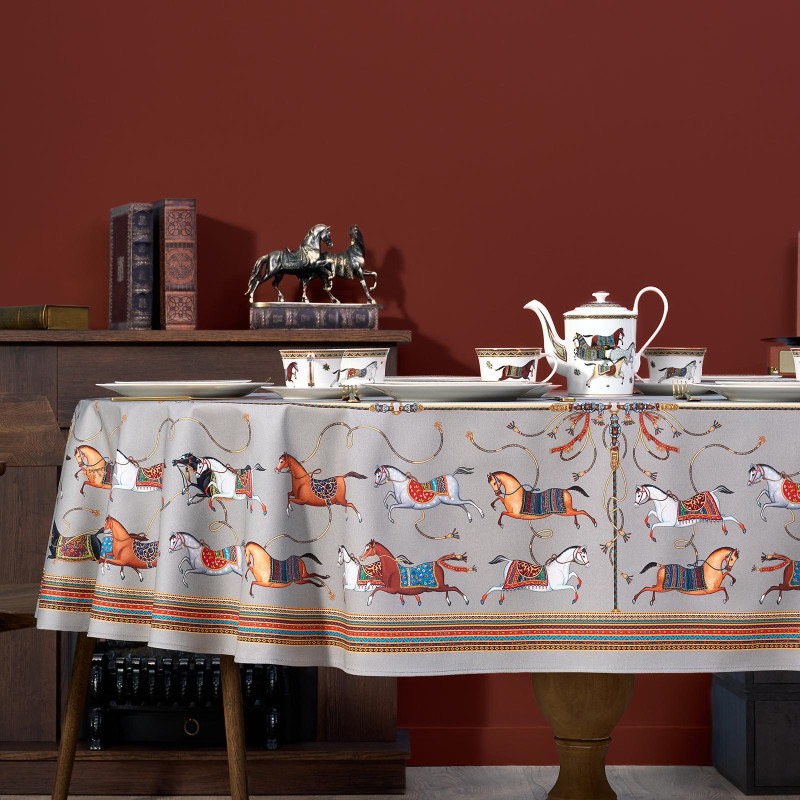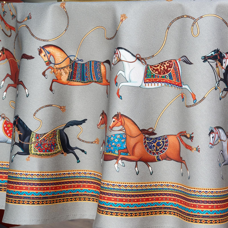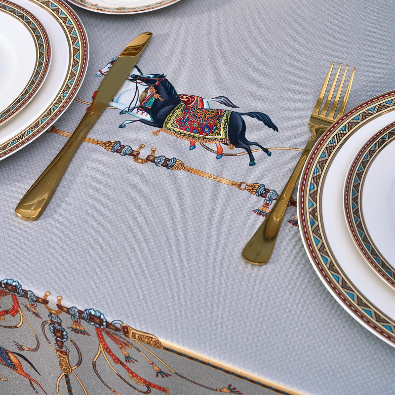 Благородный фон украшен орнаментом с грациозными лошадьми, создавая атмосферу восточной роскоши. Лошадь — символ 2026 года, поэтому скатерть будет актуальна как для ежедневного использования в интерьере в стиле бохо, так и для праздничной сервировки. Авторский принт разработан художниками эксклюзивно для Lefard и нанесён методом цифровой печати, что гарантирует яркость и стойкость красок даже после множества стирок.