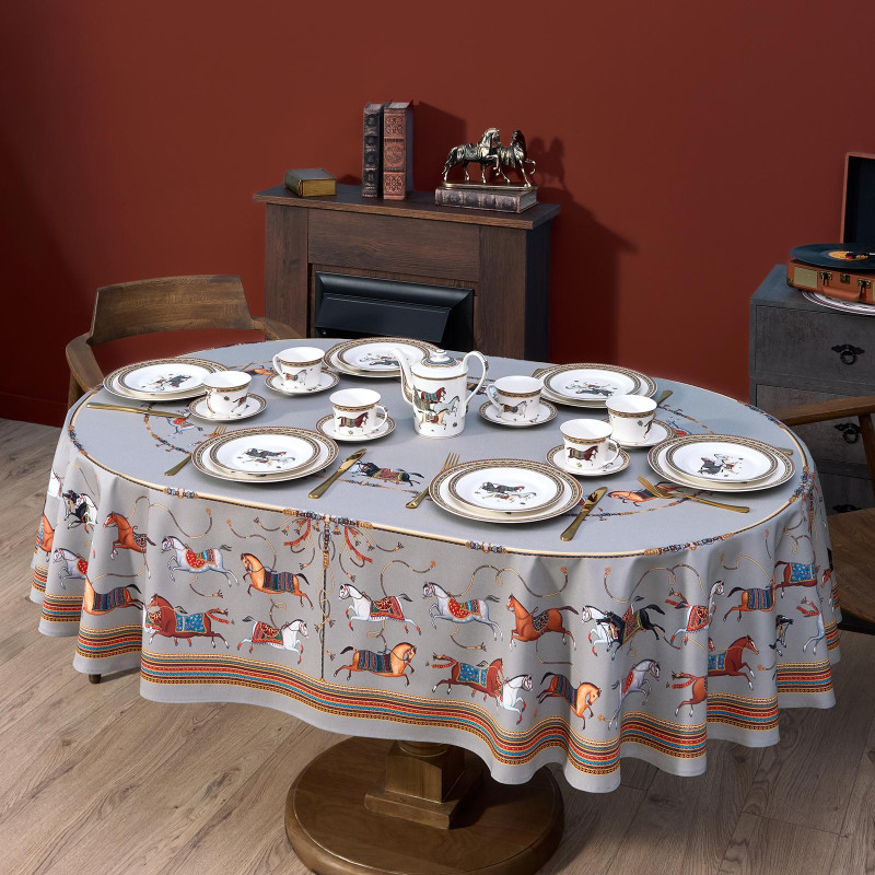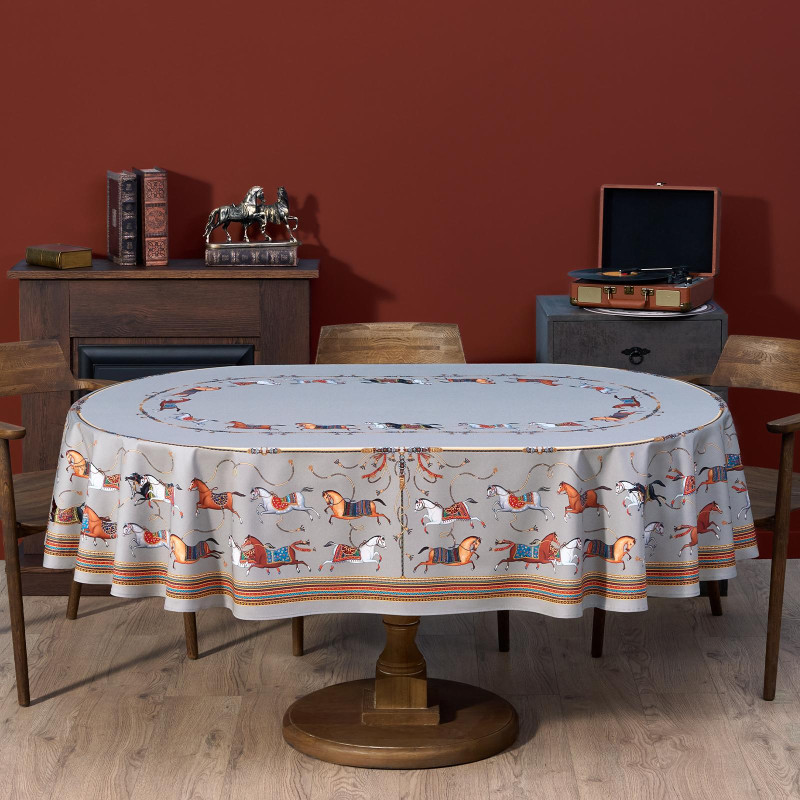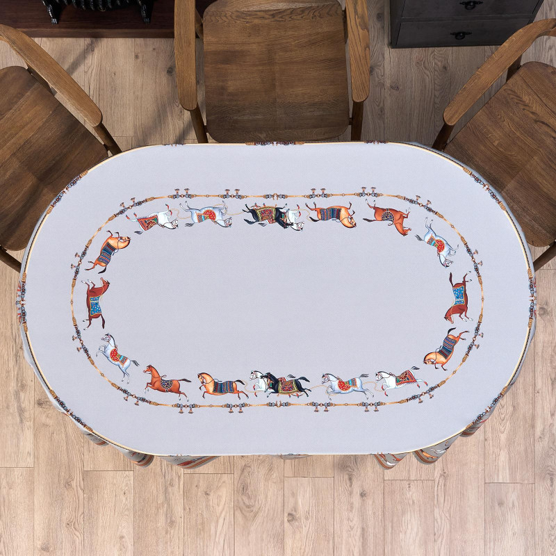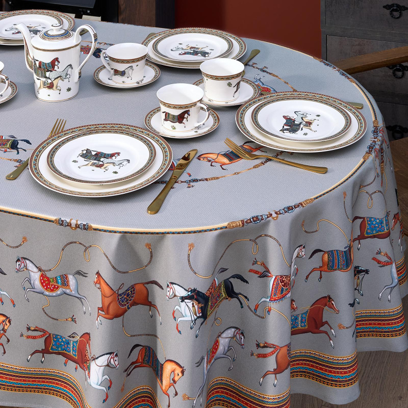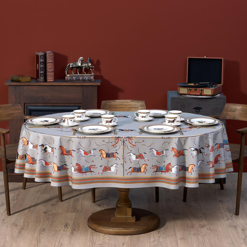 Благородный фон украшен орнаментом с грациозными лошадьми, создавая атмосферу восточной роскоши. Лошадь — символ 2026 года, поэтому скатерть будет актуальна как для ежедневного использования в интерьере в стиле бохо, так и для праздничной сервировки. Авторский принт разработан художниками эксклюзивно для Lefard и нанесён методом цифровой печати, что гарантирует яркость и стойкость красок даже после множества стирок.