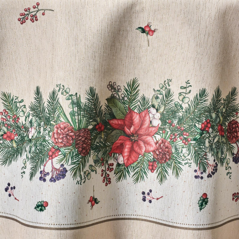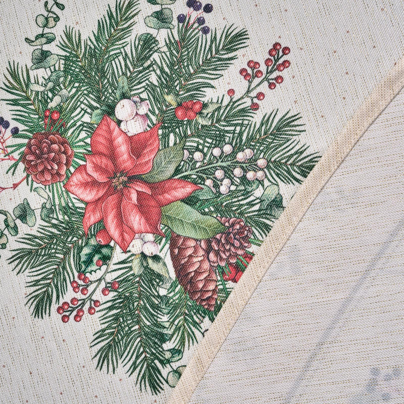 Принт вдохновлён мотивами зимнего леса: еловая зелень, алые ягоды и шишки образуют композицию, напоминающую рождественский венок. Рисунок передаёт свежесть зимнего утра и наполняет интерьер праздничным настроением. Рисунок выполнен по эксклюзивному дизайну Lefard методом цифровой печати — чёткие линии, насыщенные оттенки и стойкий рисунок. Композиция продумана так, чтобы скатерть эффектно смотрелась с любой стороны и сочеталась с посудой и текстилем из одноимённой серии.