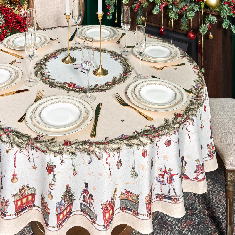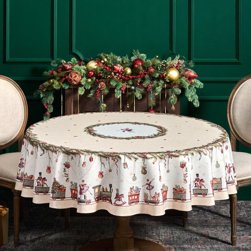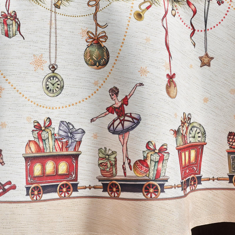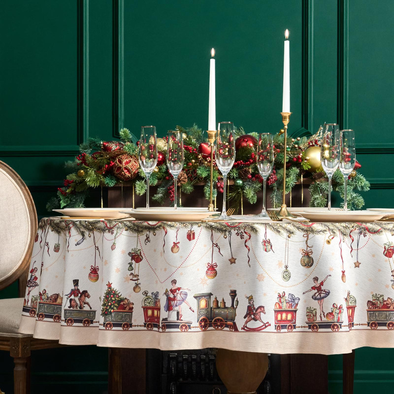 Принт вдохновлён знаменитой сказкой «Щелкунчик» в центре балерина и принц, а по краю оживает рождественская композиция — игрушки, еловые ветви, гирлянды и миниатюрная железная дорога. Эта скатерть словно сцена из новогоднего спектакля — наполняет дом теплом, уютом и ожиданием чуда.
