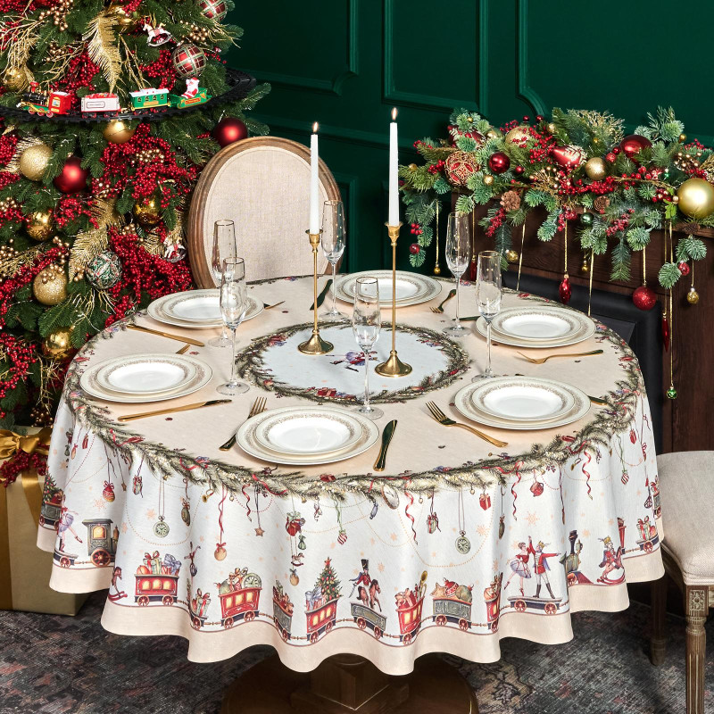 Диаметр скатерти 185 см. Она подходит для столов диаметром от 120 до 160 см, обеспечивая красивый равномерный свес и аккуратную посадку по краям. Универсальный размер позволяет использовать её как для повседневных ужинов, так и для торжественной новогодней сервировки.