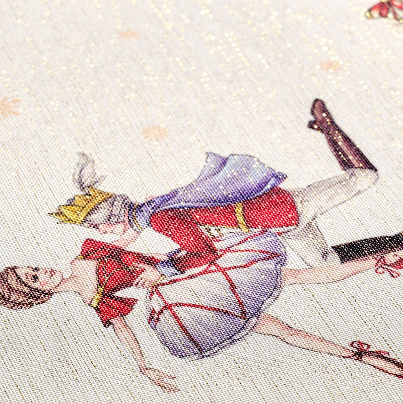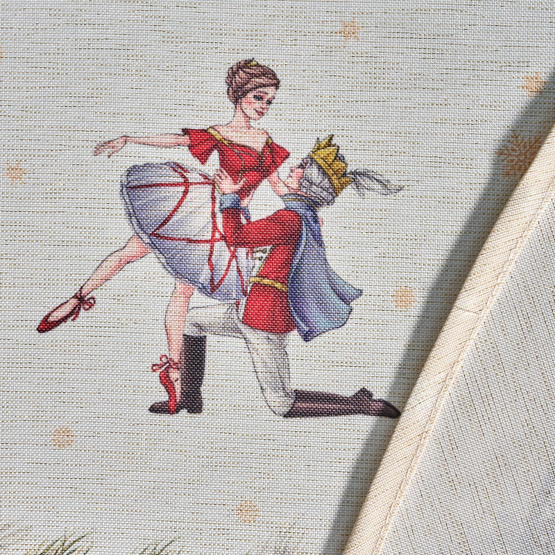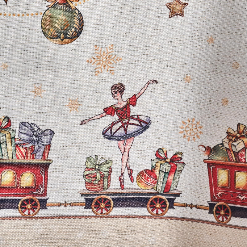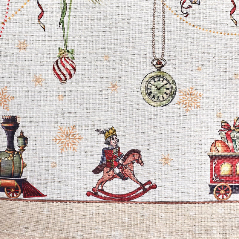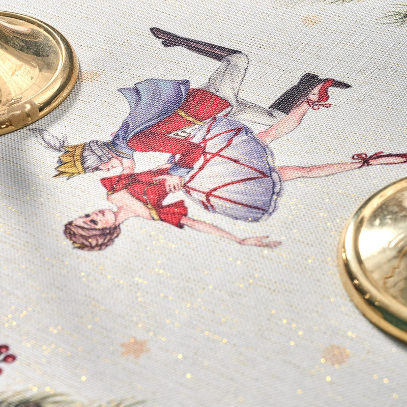Принт переносит нас в волшебную историю Щелкунчика: в центре балерина и принц в танце, а по краю оживает рождественский мир — игрушки, фонарики и миниатюрная железная дорога. Эта скатерть словно кадр из сказки — наполняет дом теплом, уютом и ожиданием чуда.