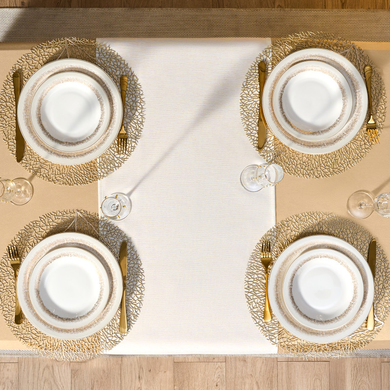 Хорошо комбинируется с однотонными скатертями, посудой в классическом или прованском стиле, текстилем в зимней палитре. Подходит для дома, дачи, загородного коттеджа. Размер 45×300 см идеально подойдёт для прямоугольных и овальных столов, позволяя создать аккуратный и завершённый образ сервировки.