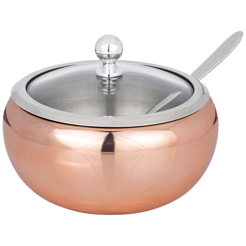 Сахарница выполнена из нержавеющей стали, имеет прозрачную крышку, сквозь которую видно количество содержимого, и ложечку для насыпания, которая располагается в выемке на корпусе сахарницы.