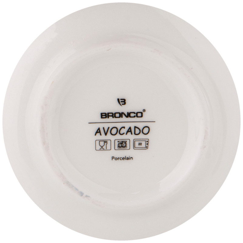 TM BRONCO коллекция «AVOCADO». Это посуда ультрасовременных форм и размеров из упрочненного фарфора для сервировки стола, покрытая матовой цветной глазурью с изображением модного фрукта Авокадо. Уже долгое время авокадо украшает одежду, посуду, с его добавлением делают шоколад, чипсы, готовят вкусные и полезные салаты. Это посуда для энергичных, живущих интересной жизнью и заботящихся о своем здоровье. В коллекции есть кружки и чайные пары, тарелки, салатники и блюда. Легко накрыть изысканный незабываемый стол. Хороший подарок. Продукция сертифицирована. Безопасна для контакта с пищевыми продуктами. Фарфоровые изделия можно использовать в микроволновой печи, мыть в посудомоечной машине с применением мягких неабразивных средств.
