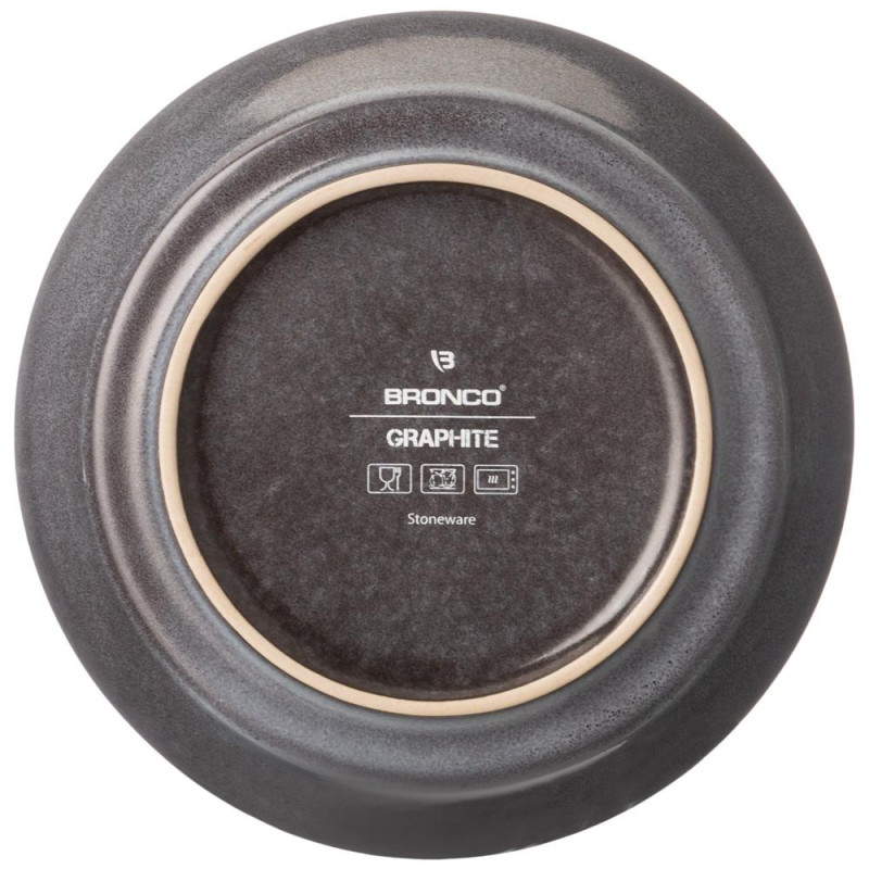 Коллекция ТМ BRONCO Graphite глубокого серого цвета с великолепным графическим подглазурным рисунком и стильной удобной формы оптимальных размеров. Все изделия выполнены из высокотемпературной каменной керамики и обожжены при температуре от 1100 до 1400 градусов. При такой температуре вода и воздух из глиняной массы полностью испаряются и изделия становятся легче, плотнее, крепче, приближаясь по своим характеристикам к фарфору. Современные рестораторы выбирают каменную керамику именно из-за её прочности и стойкости к перепадам температур. Поверхность изделий покрыта глянцевой реактивной глазурью. Изделия не впитывают вкусы и запахи продуктов, хорошо сохраняют тепло и холод. Они легки в уходе, вызывают приятные тактильные ощущения, длительное время сохраняют первоначальный внешний вид. Каменную керамику можно мыть в посудомоечной машине, использовать в микроволновой печи.