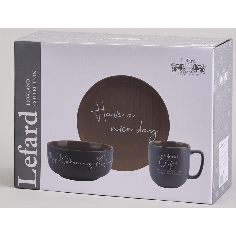 НАБОР ПОСУДЫ LEFARD 3 ПРЕДМЕТА "COFFEEMANIA" изготовлен из фарфора высокого качества и предназначен как для ручной мойки, так и для мытья в посудомоечной машине, может использоваться для разогревания еды в микроволновке. Такие кухонные принадлежности станут прекрасным дополнением для Вашей столовой посуды как дома на кухне, так и в кафе, ресторане или офисе. Комплект посуды из 3 приборов идеален для использования в повседневной жизни и для приема гостей.