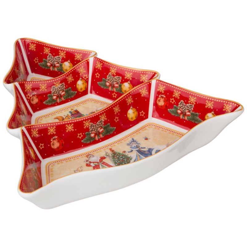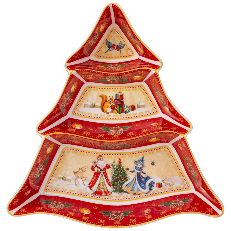 Менажница-елка "ДЕД МОРОЗ И СНЕГУРОЧКА" 24*24*3 см красная (кор=12шт.) LEFARD 85-1748