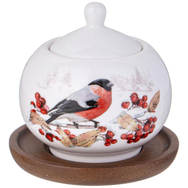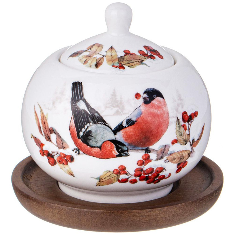 Сахарница "ЛЕСНАЯ СКАЗКА" снегири 380 мл на дерев. подставке (кор=36шт.) LEFARD 85-2024