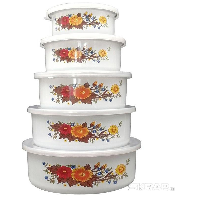 008764 Набор из 5 эмалированных мисок с крышками, FAMILIA, Mallony белый с дизайном