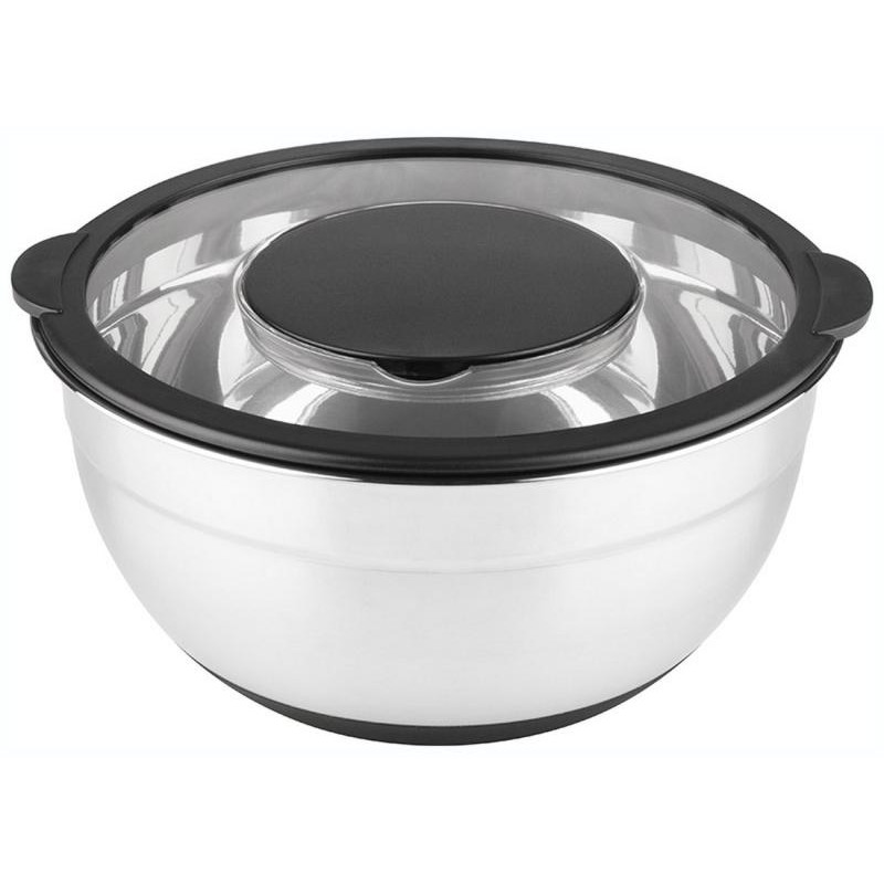 4.5л, 27х26х12.5см, нерж.сталь/силикон/пластик, зеркальная полировка внутри и снаружи, отметка литража, крышка прозрачная пластик. с отверстием d12.3см под терки d12см, с крышкой из пластика с силиконовыми краями