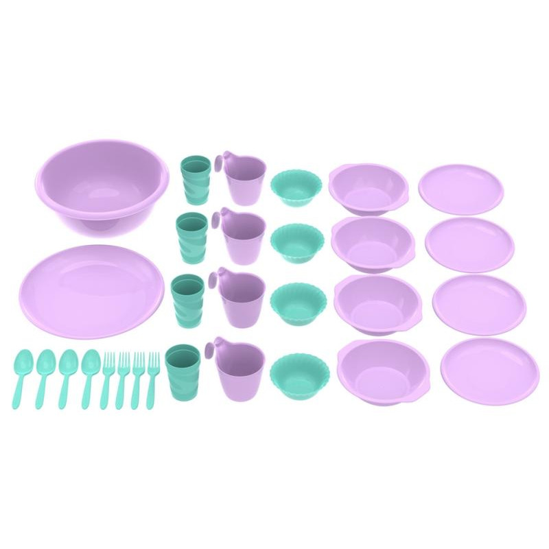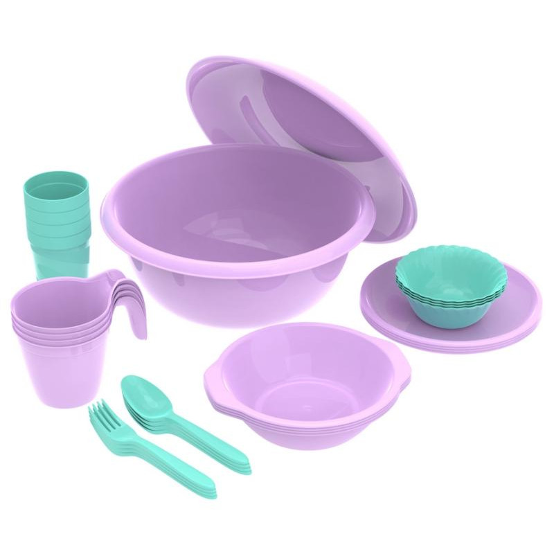 30предм, пластик, на 4 персоны, миска 5л, тарелка 30.5см, тарелки 0.7л - 4шт, тарелки 19.5см - 4шт, салатники 0.26л - 4шт, стаканы 250мл - 4шт, кружки 400мл - 4шт, вилки - 4шт, ложки - 4шт