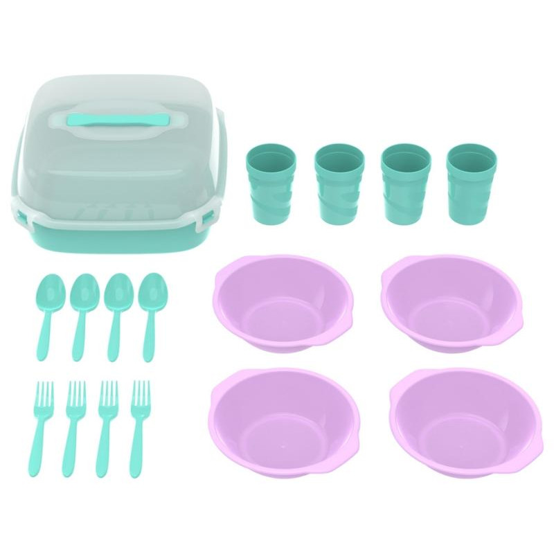 17предм, пластик, на 4 персоны, контейнер 9л, тарелки 0.7л - 4шт, стаканы 250мл - 4шт, вилки - 4шт, ложки - 4шт