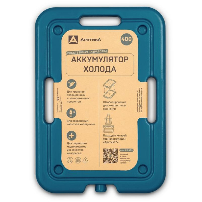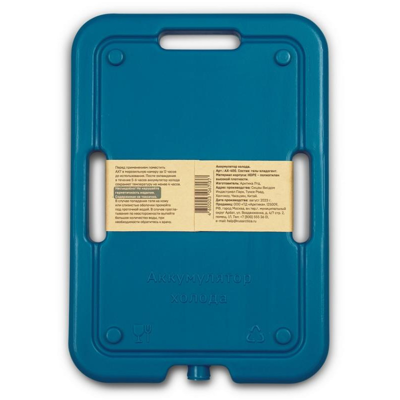 0.4л, гелевый аккумулятор, тоньше стандартного аккумулятора холода, корпус оснащен специальными отверстиями, чтобы связать комплект при переноске, не скользят при складывании друг на друга, благодаря специальным пазам